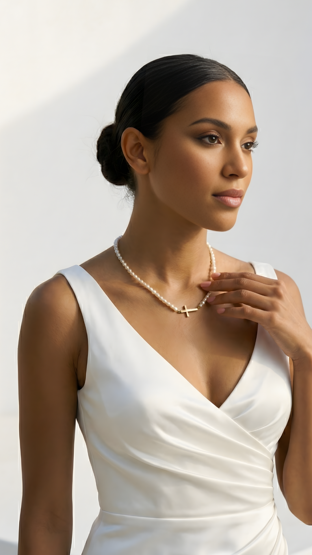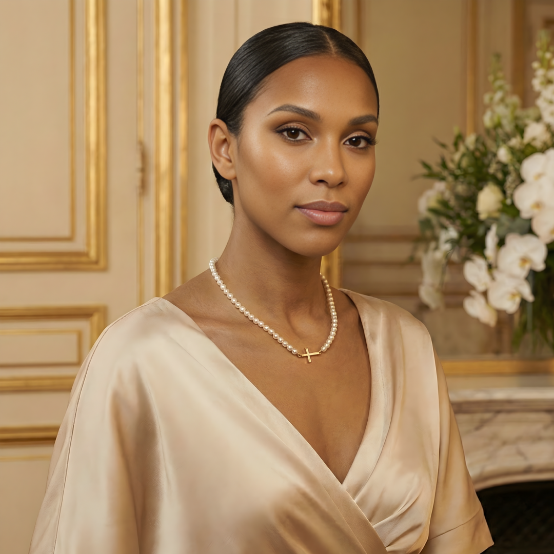 I love that it has a cross without looking too traditional. The pearls make it feel so elegant, and the gold pendant gives it that clean, luxury touch.
